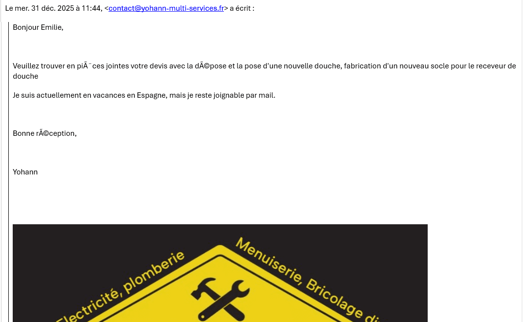 Pour faire l'envoie je clic sur le bouton envoyer par mail, mon logiciel outlook s'ouvre mais il est en mode texte brut (habituellement en mode HTML) pour pouvoir ajouter ma signature je bascule manuellement outlook en mode HTML mais dans ce cas, les clients reçoivent le mail avec des caractères spéciaux à la place des accents (voir PJ) ce qui n'est pas le cas quand j'envoie un mail directement via outlook sans passer par free devis facture.