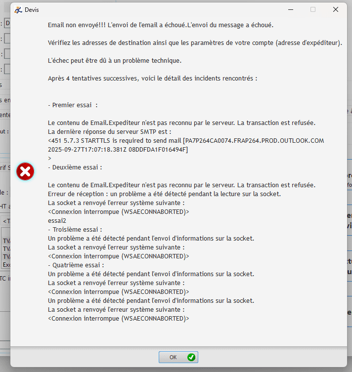 Si malgré cela l’envoi ne fonctionne toujours pas, la solution la plus simple reste d’utiliser l’option "Lancer l’application de messagerie" (MAPI) pour que l’email s’ouvre directement dans Outlook(l'application) ou Thunderbird, avec vos paramètres déjà configurés.