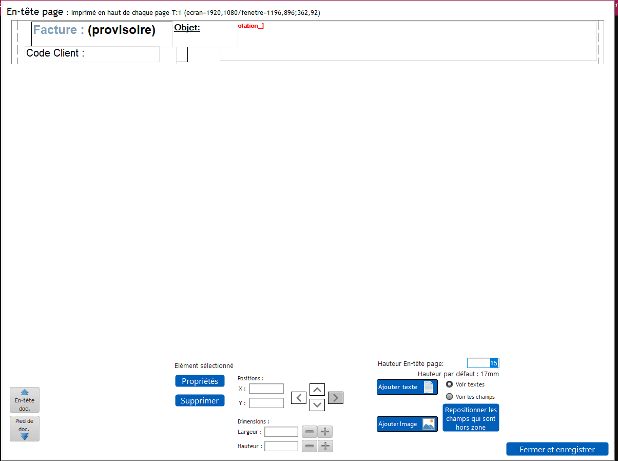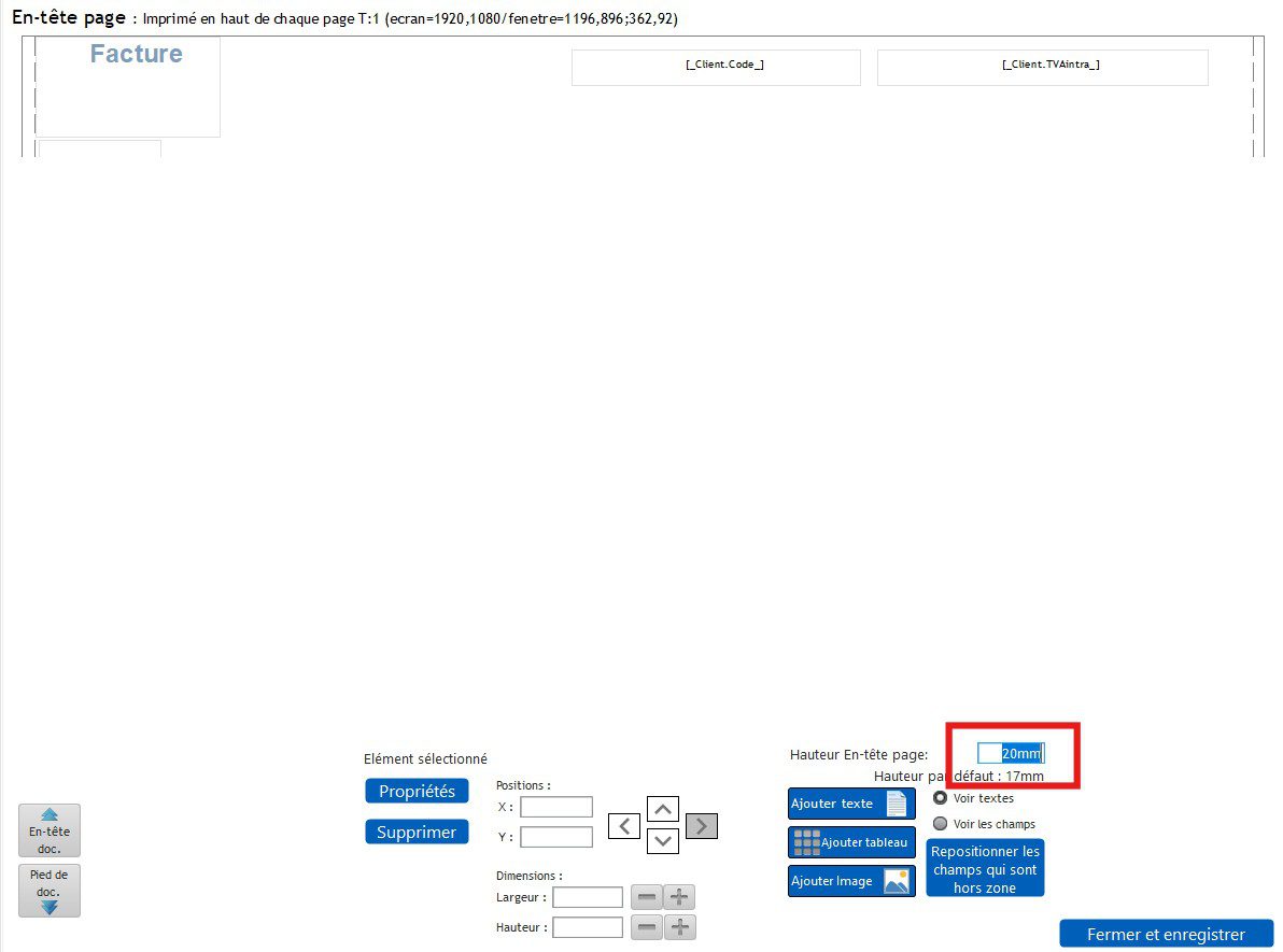 Pour la modifier, cliquez sur le menu "Impressions", onglet "Zones" et cliquez sur le bouton "Modifier l'en-tête page". Dans le champ "Hauteur En-tête page:", saisissez 20mm.