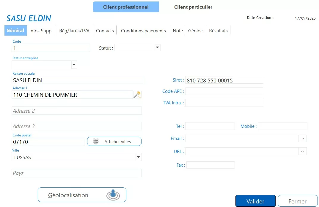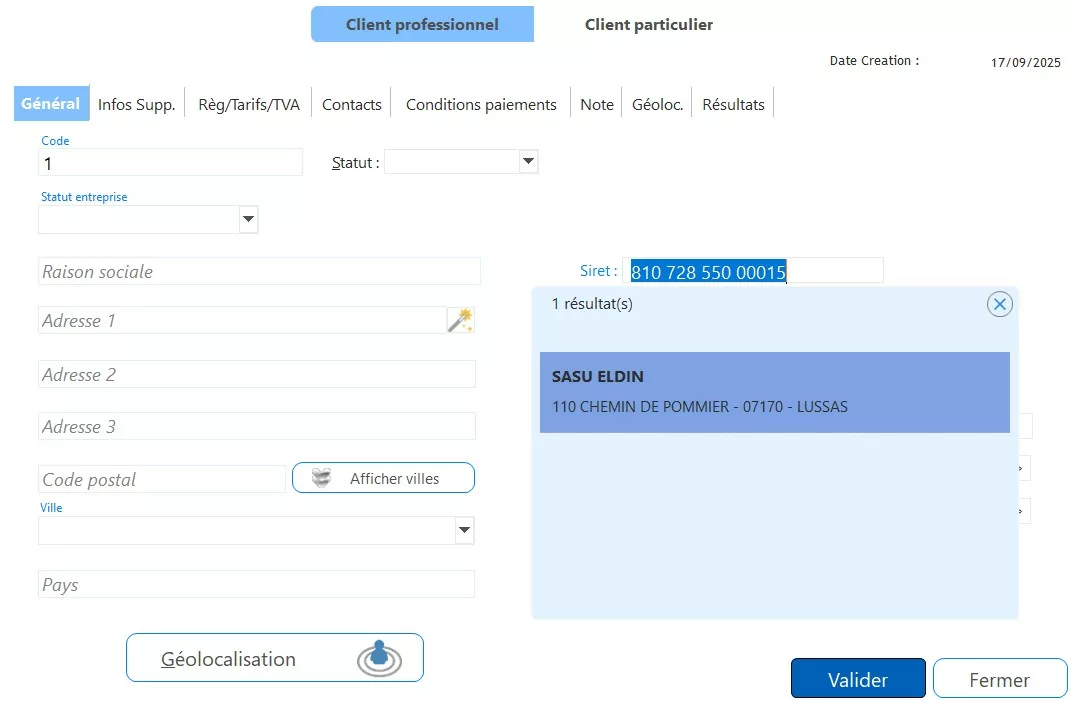 Pour un client professionnel, il suffit de taper quelques caractères dans le champ Raison sociale.